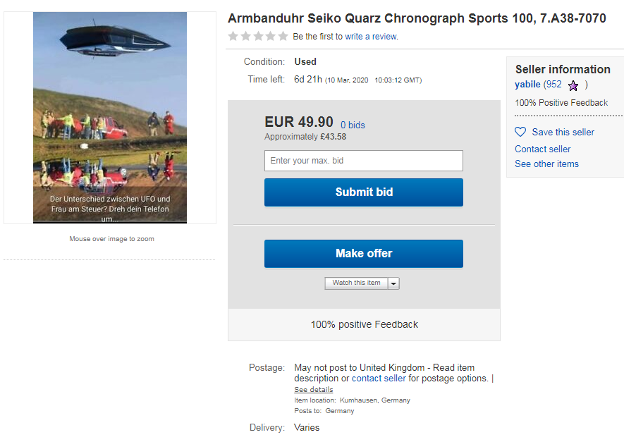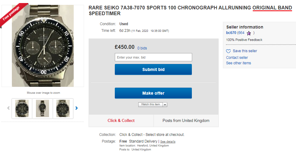 The UK eBay seller re-listed that 7A38-7070, fitted with a non-original replacement bracelet, 4 times, as 7-day auctions, keeping the same totally unrealistic opening bid price of £450. The most recent re-listing ended this afternoon, when the watch sold for an undisclosed best offer. Presumably one considerably less than £450. http://www.ebay.co.uk/itm/254530303456