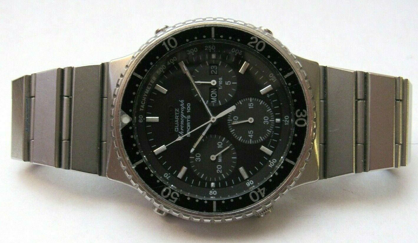 Armbanduhr Seiko Quarz Chronograph Sports 100, 7.A38-7070. Zustand: in m.E. beinahe sehr gutem Gebrauchtzustand. Die Uhr stammt aus einer Sammlung und wurde nur einige Male getragen. Versand mit DHL Paket bis 2 kg. | |