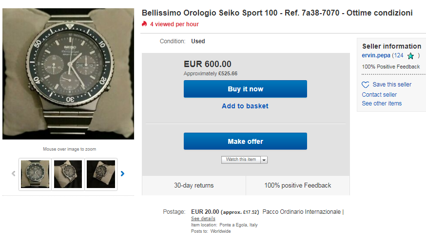 Over the last two days, an Italian eBay seller ervin.pepa listed a number of 7A's. He appears to be selling off a collection. Generally speaking, they're all typically speculatively over-priced for their condition, regardless. His favourite price point appears to be an exceedingly ambitious 600 Euros. Yesterday evening, among other 7Axx watches, he listed this 7A38-7070, in no better than average condition. http://www.ebay.co.uk/itm/124185082626