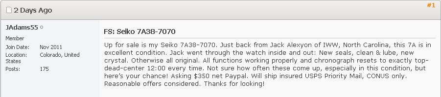 I had my doubts about the originality of the finish on that 7A38-7070. In places it looked too dark (and others too good). Then there were obvious things wrong, like the sides of the SQ clasp, which should be bright polished along its perforated sides. So I sent the WUS seller a PM asking him outright if it had been bead-blasted. He conceded that he believed it had (by Jack of IWW, during his restoration) and agreed to amend his FS advert to reflect this. Here's a screen print of the updated post: http://forums.watchuseek.com/f29/4513583.html FS: Seiko 7A38-7070