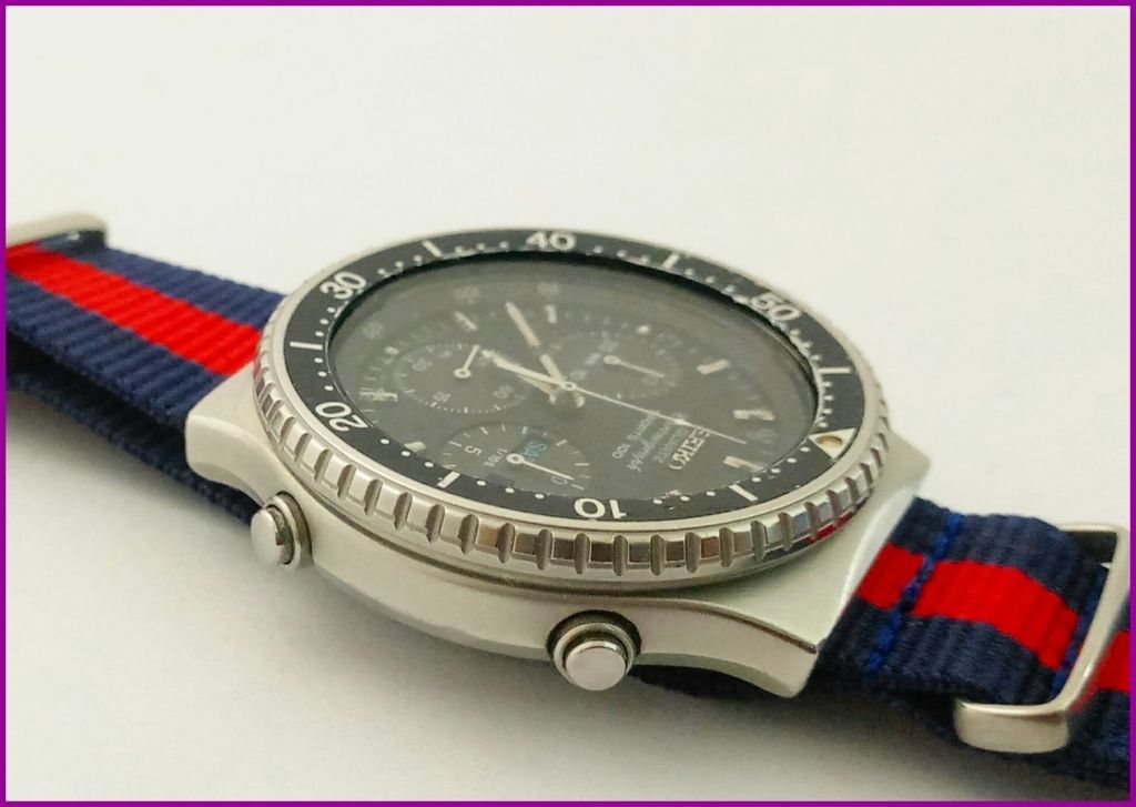 Montre plongée SEIKO CHRONOGRAPH SPORTS 100 quartz Couronne d'origine linette bidirectionnel 60 clics fonctionne parfaitement boite acier et fond acier verre minéral rayé Cadran en bel état Aiguilles en bel état Mouvement 7a38 quartz parfait état 40MM hors couronne bracelet acier d'origine 7€ pour la France 13€ pour l’Europe 24€ pour le reste du monde PS - If like me, you were wondering where you'd seen the French eBay seller's ID watchover15 before, he's previously sold a couple of Yema N8's on eBay, fairly recently, both of which were documented in the 'Spotted' thread. | |