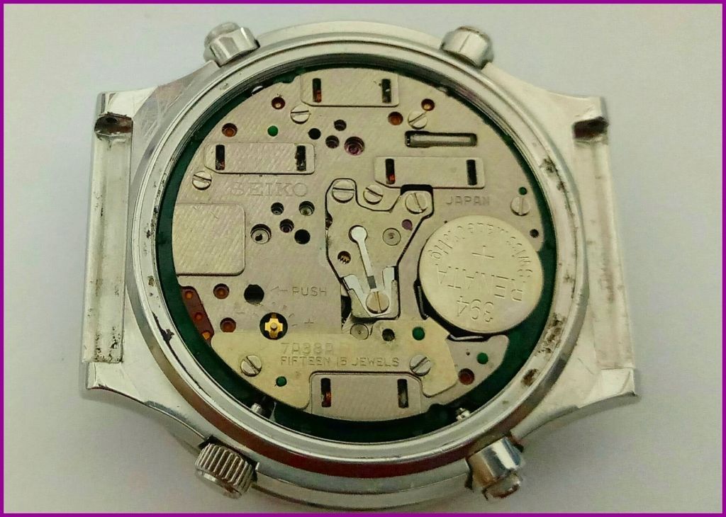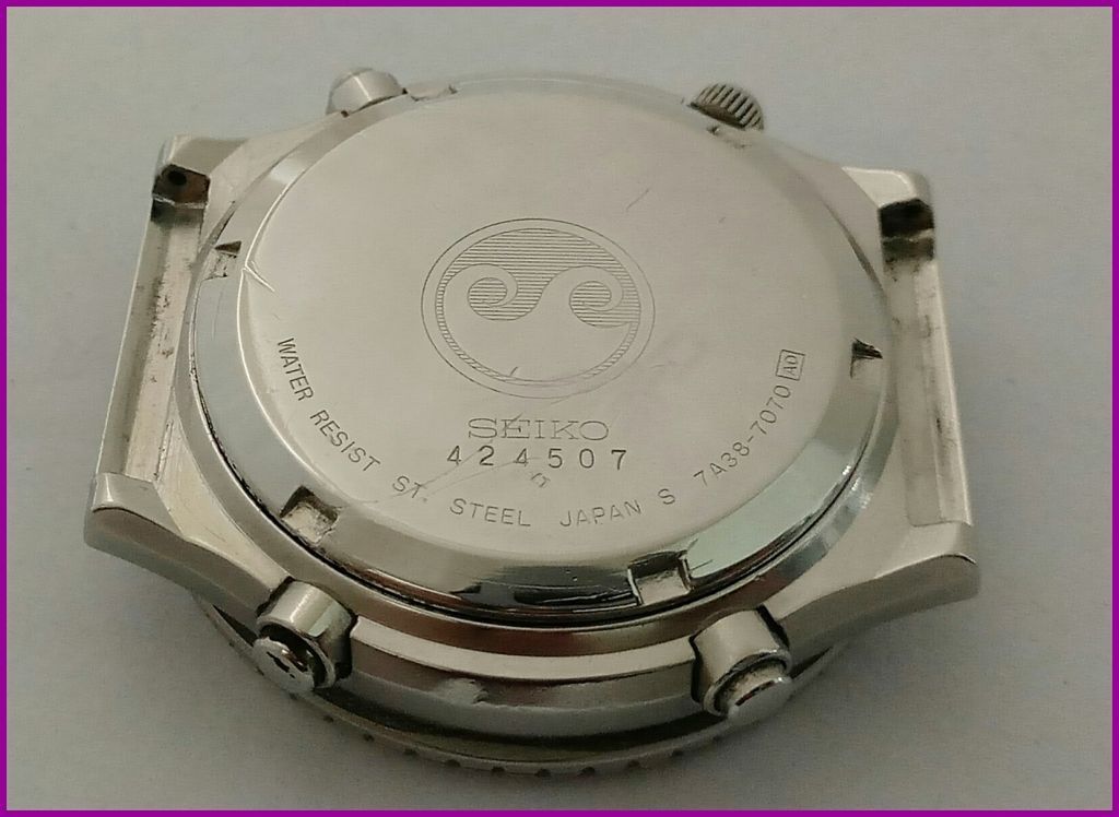 It doesn't take a particularly close examination of the seller's photos to detemine that this was once in fact a 7A38-7080, that has been stripped of its black chrome coating. There's still plenty of evidence of that - in the bezel and crown knurling, around the pusher cups and in the lug boxes. Of course the case-back stampings give the game away: