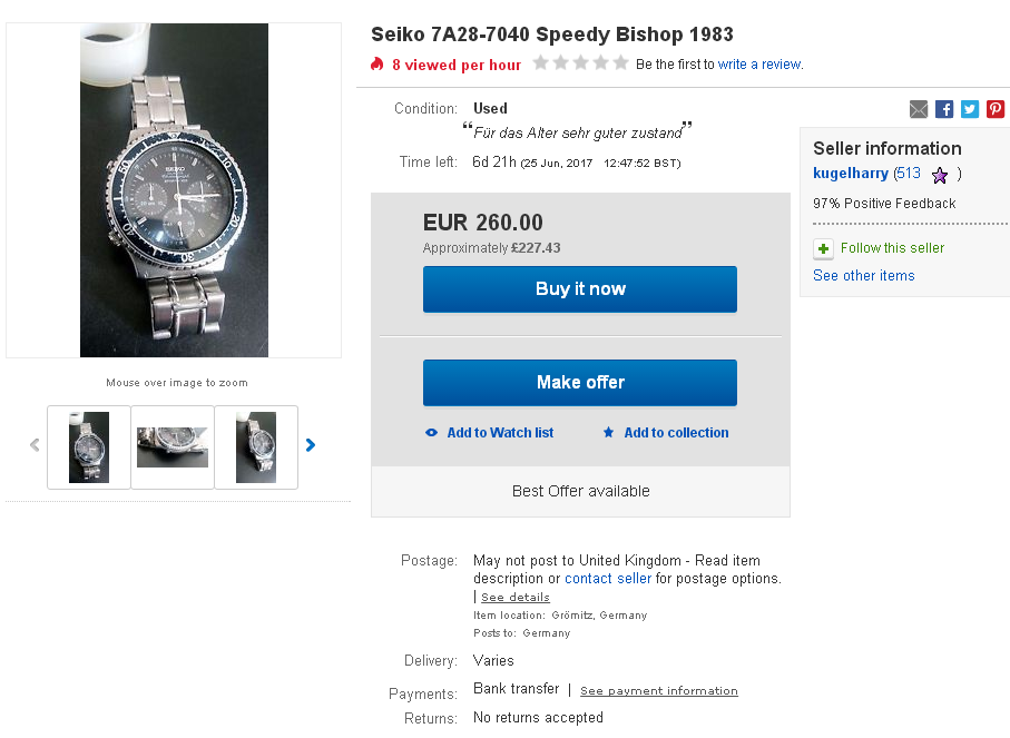 It's noticeable how quicky nice examples sell (sometimes regardless of price), whereas the dross - or should I more politely say 'lesser examples' take a little longer to shift. Particularly if they're mis-described and stupidly over-priced for their condition. One such, is the well-worn example, fitted with an obviously non-original bracelet, listed by German eBay seller kugelharry, which first appeared in mid-June with a pie-in-the-sky Buy-it-Now price of 260 Euros (first mentioned halfway down page 3 of this thread). He's continued to re-list it, with different pricing - maybe a dozen times now. Here's a summary of some recently ended listings.