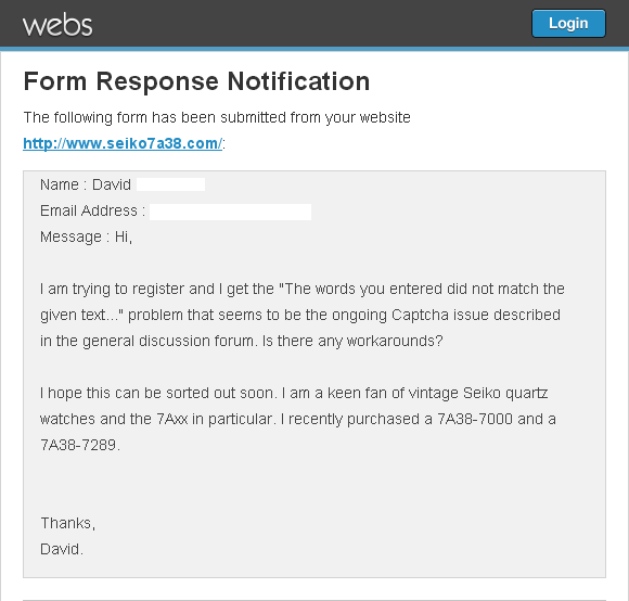 I've since received two more similar messages via the contact form, from potential new members, who've tried (and failed) to register on the forum - 'Alex' and 'Joe'. At least they had the sense to try this route, but it makes me wonder how many others may have attempted to register, given up in disgust and walked away. There is currently no official Webs Community topic documenting this particular problem. The existing topic on Captcha V1 Shutdown was ever so conveniently tagged as 'COMPLETED' on 30th March - a day before it came into effect and the real problems started.