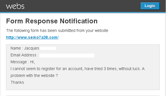 Yesterday, I received another (the 6th) message though the contact form. Jacques doesn't state the nature of his specific problem, but I think it's safe to assume it's the non-functional Captcha that's preventing him from registering.