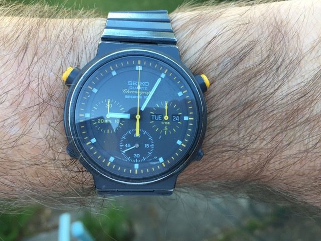 Left to Right: Stainless 7A38-7020 fitted with an incorrect replacement bracelet, presumably the ubiquitous Seiko p/n Z1357S. 'PVD' 7A38-704B and 7A38-7140. The 7A38-701B 'Vulcan', which appears to be a very nice example, now fitted with the correct p/n Z1118S bracelet. Not sure if Tim has temporarily 'borrowed' that bracelet from the 7A38-7010, or whether (as I'd suggested in my email) he's taken it off one of the 7A28-7040's which both appeared to be fitted with the same (wrong) bracelet. | |