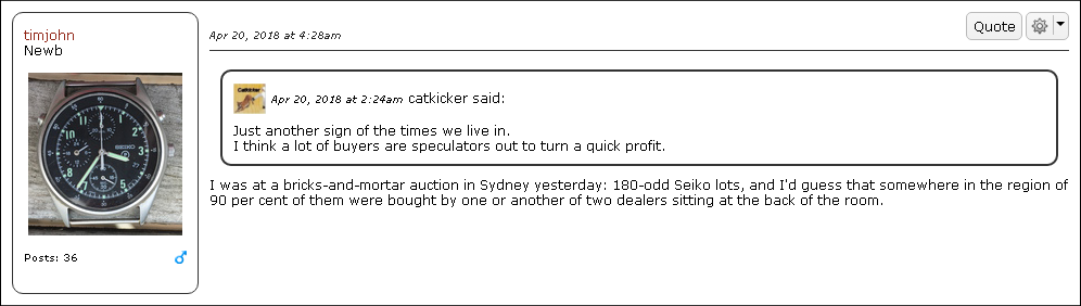 For those of you who aren't members of WristSushi (I'm not - banned long ago) or who hadn't seen the thread where Tim dropped his bombshell news, here's a link: http://wristsushi.proboards.com/thread/16803/auction-pickings His first post starts off: There was an auction in Sydney last week, and the prices were attractive, so I went on a bit of a spree. Ignore the first two posts and scroll down to his third post: