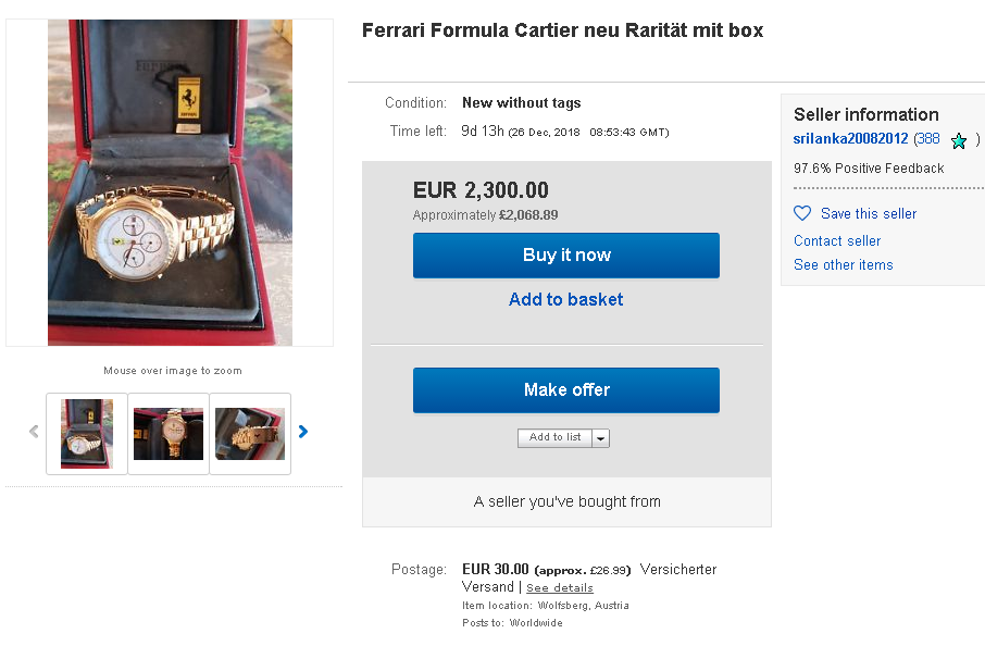 I have to admit, I'm not sure what became of the original subject of this thread - Austrian eBay seller srilanka20082012's 'fake' gold plated Cartier Ferrari Formula. He re-listed it, but then it seems to have disappeared into the ether. Don't ask me why, but I'd added the eBay listing for the genuine 18K 7750 to my eBay watching page - and occasionally observed it being continually automatically re-listed. http://www.ebay.co.uk/itm/352494585874