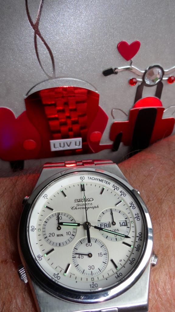Another grey overcast winter's day, so I thought I'd dig out something which given the right lighting conditions can add a little twinkle. It's a franken I built back in May 2010 as an 'experiment'. Liked it so I kept it. Basically it's the silvery-grey dial and hands of a two-tone 7A38-6080 in a 7A38-7289 two-tone case and bracelet (the silver Tachymeter ring is ex 7A38-7190). I hadn't worn it in over a year.
