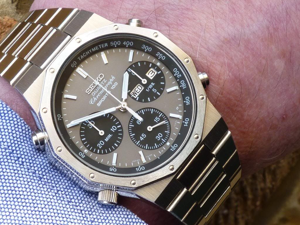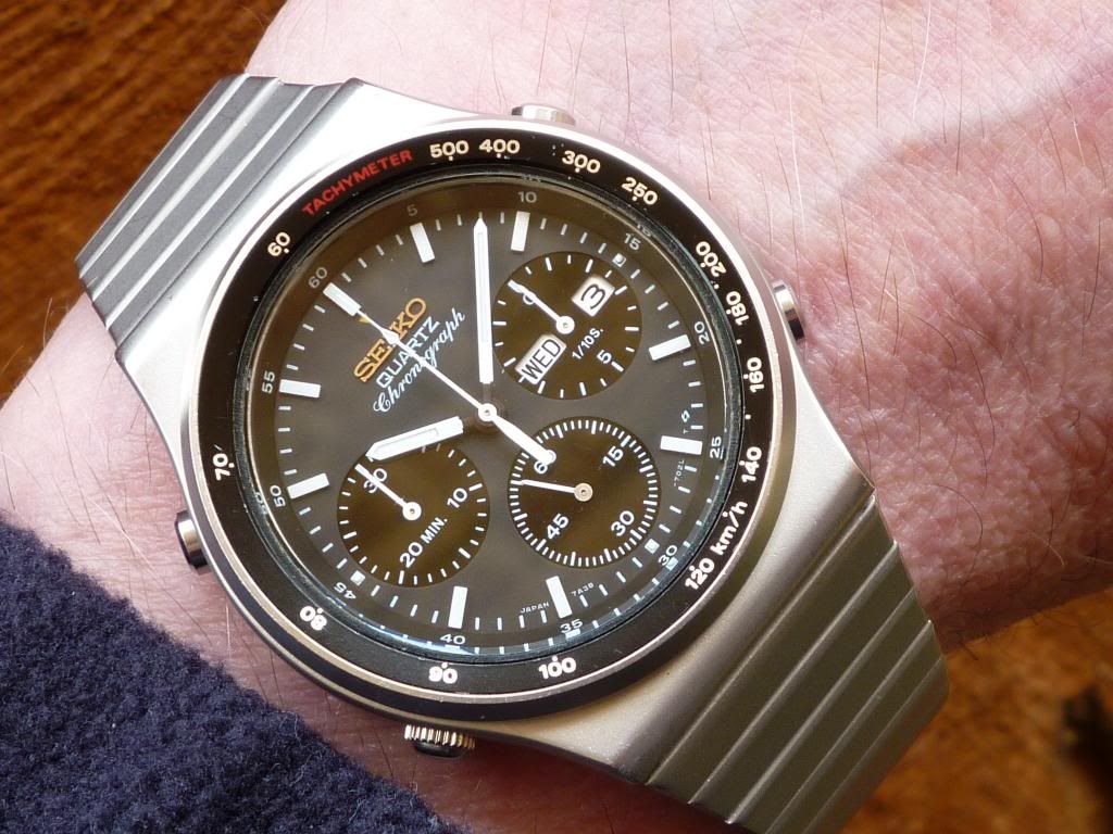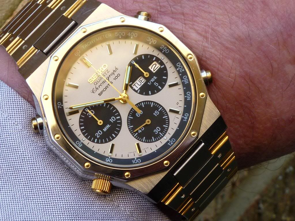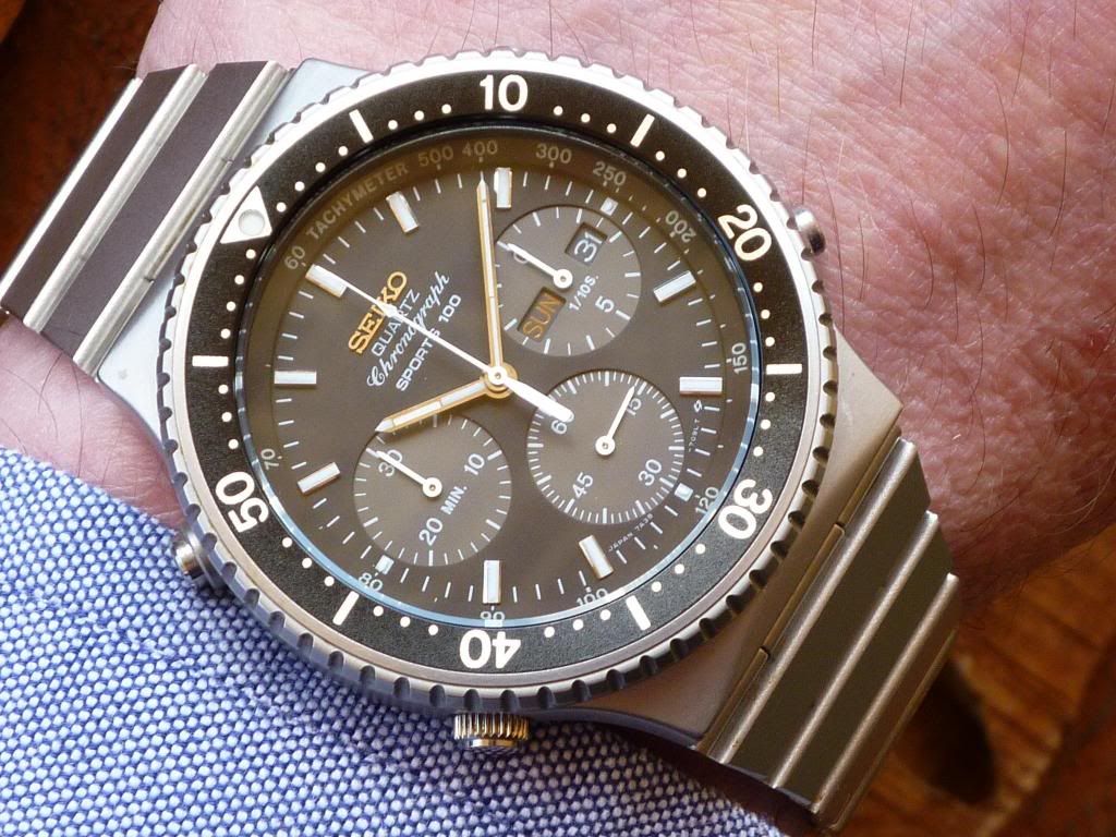 For the benefit of those readers who are wondering what we're discussing, here's a Q&D wrist shot of a 7A38-7010 SAA001J - as they left the Seiko factory with the correct (black lettering on white background) contrasting, rather than matching day and date wheels: