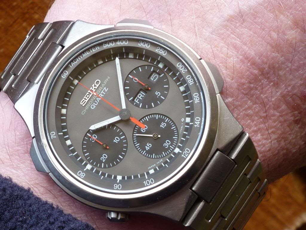 Nice little watch for a sunny but cold day. I love the patina of ageing titanium. 7A28-7080.