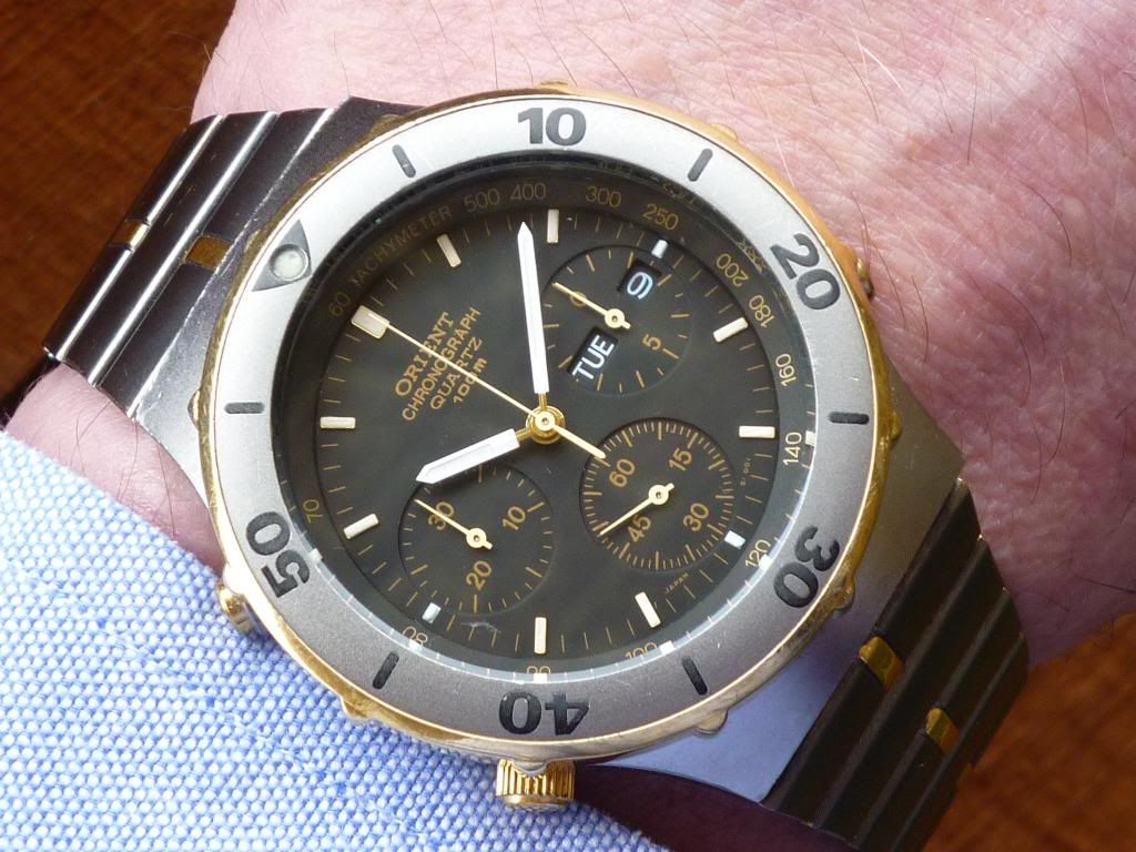 Good job we're not all too scared of getting our watches wet, to step out inbetween showers to grab a quick wrist shot, eh Harry ? Not that I'd want to risk so much as doing the washing up wearing this 'diver'. The very first Orient J39 that I added to my collection, courtesy of German collector 'Kurt'. Only one I've ever seen, too - a J39601-70.