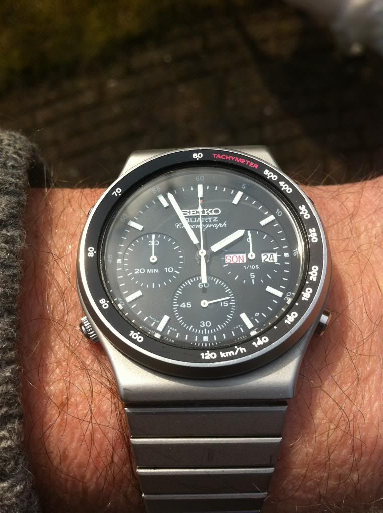 This expensive little bugger, a 7A38-7130 came in this morning. Well actually the postman allready came by yesterday but didn't give it to me because I hadn't enough CASH (completely ridiculous in this day and age) to pay 79,45 euro in duties. 79,45! Based on what I wonder. The guy who shipped it to me from the States had sent it as a gift! Happy Easter everyone! And don't forget to adjust your watches for summertime this weekend.....
