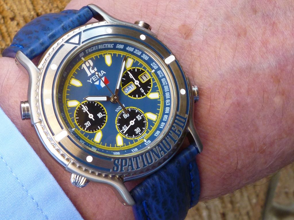 With the unusually hot weather we’ve been experiencing in England over the last few weeks (a proper summer), it’s not been practical to wear a watch on a leather strap (as all of my Yema Spationaute III’s are). I don’t like getting the straps sweat stained. Thankfully, it’s cooled off a bit and yesterday it finally rained. So today it’s a rather pleasant and balmy morning. Not that I needed any excuse, I dug out an old favourite – nicknamed Grand Bleu for obvious reasons. ![]() | |