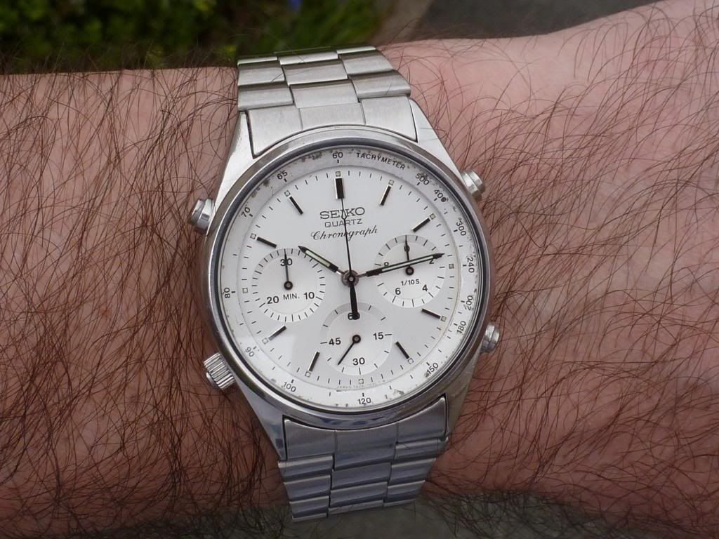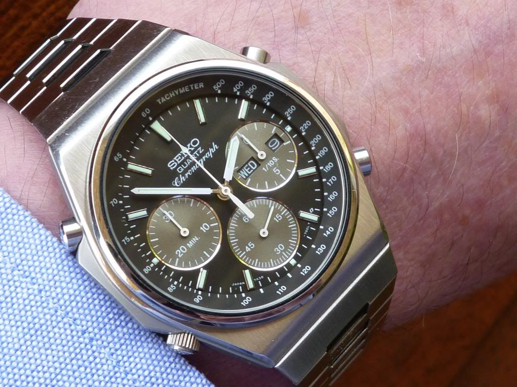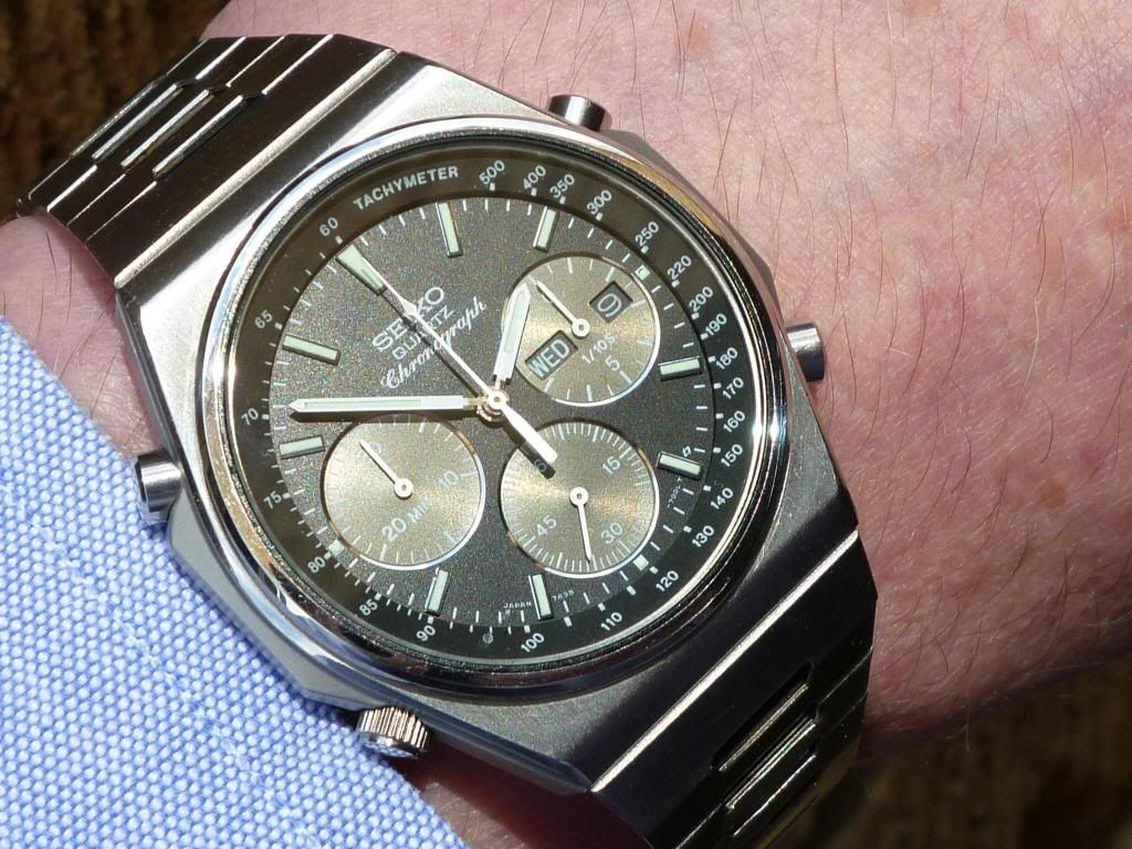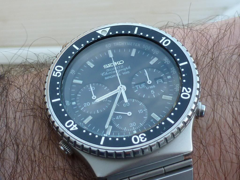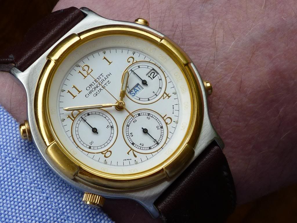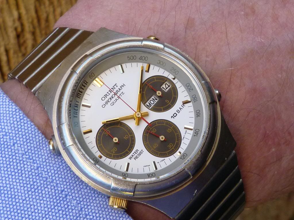 Well there's a first Chris ! Light's been pretty poor today, but I thought I'd try and do a better shot of this little Orient J39002-70. The last time I posted one the light was similarly crap, so I tried to enhance the image (not something I often bother with) by increasing the colour saturation. Fail. This one's not much better, but it's in 'natural' colours. Shows the water-damaged dial printing and the 'invisible' Tachymeter scale.