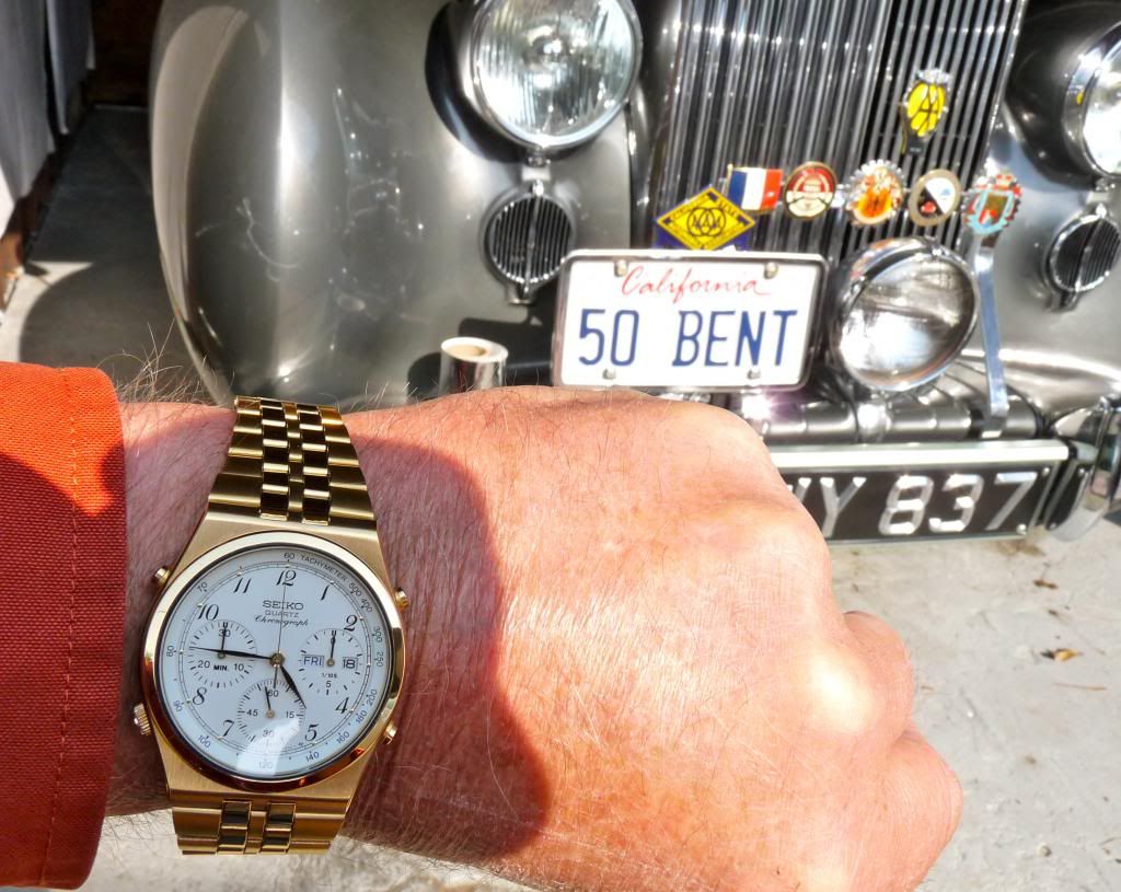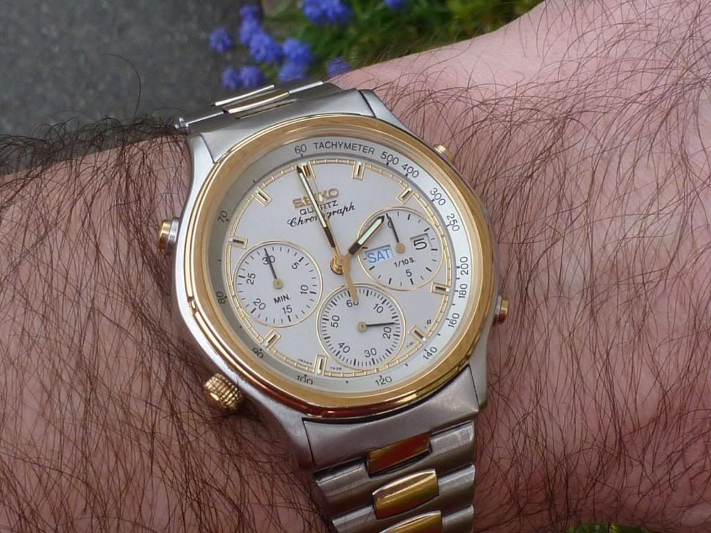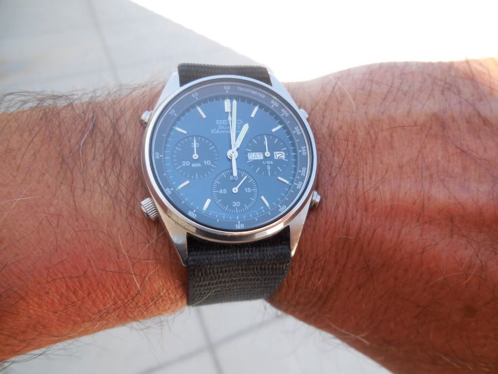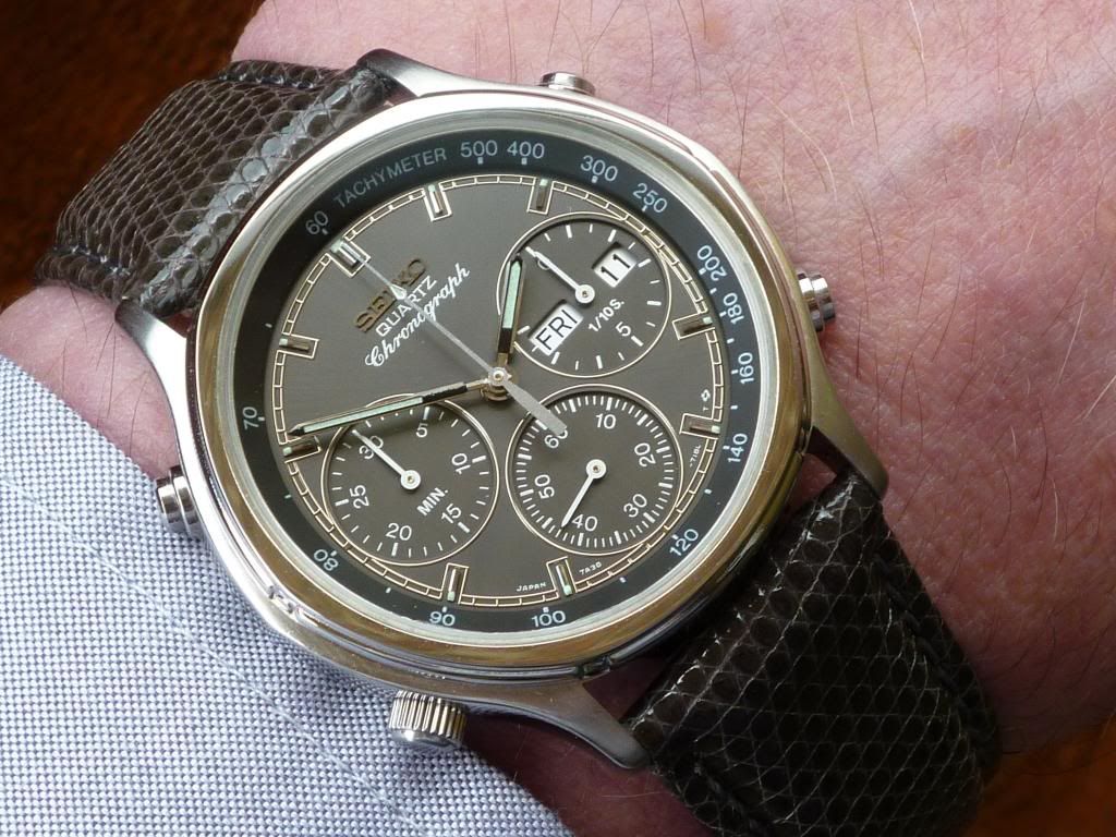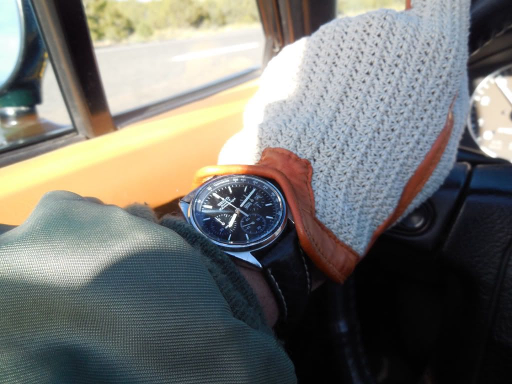 Well there's a first Chris ! Light's been pretty poor today, but I thought I'd try and do a better shot of this little Orient J39002-70. The last time I posted one the light was similarly crap, so I tried to enhance the image (not something I often bother with) by increasing the colour saturation. Fail. This one's not much better, but it's in 'natural' colours. Shows the water-damaged dial printing and the 'invisible' Tachymeter scale.