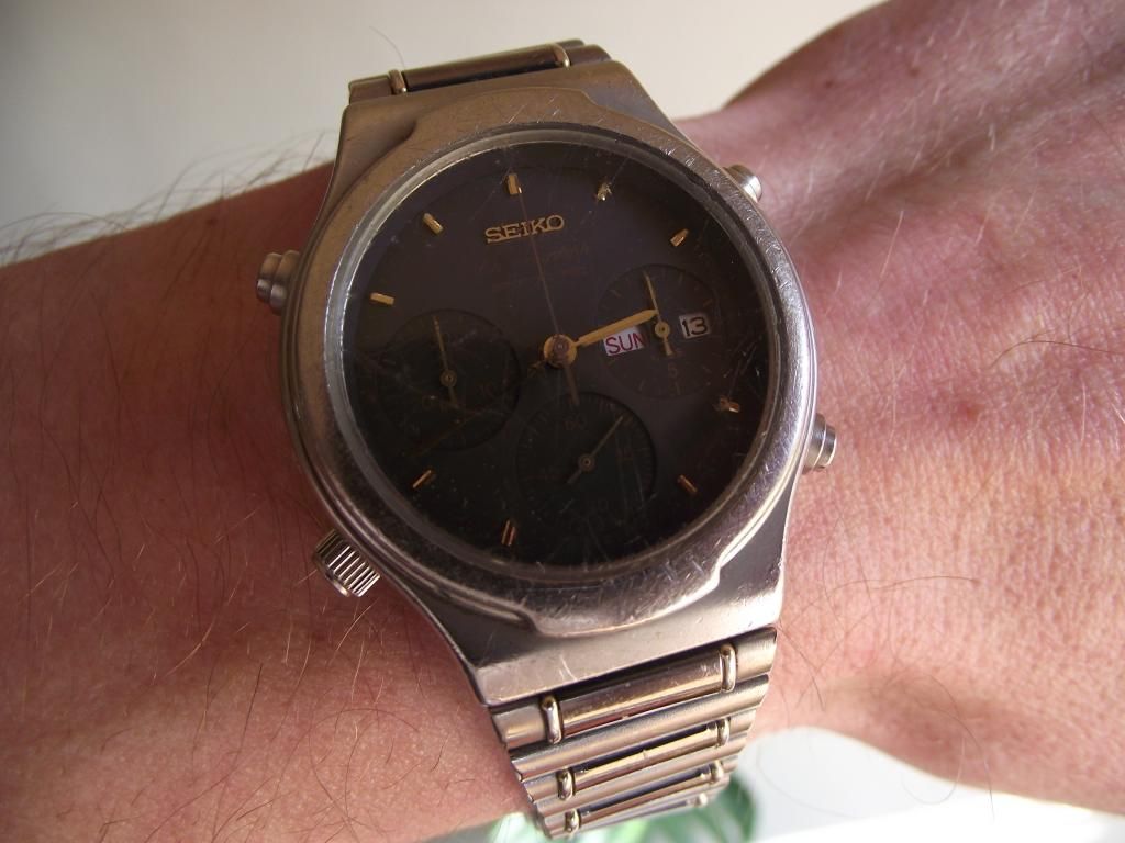 This watch is heavily worn, but the movement, dial and hands are perfect. The buttons still have that nice clicky feel when used, I am pondering whether to use the movement for a better condition watch or refinish/sandblast this case/bracelet. | |
