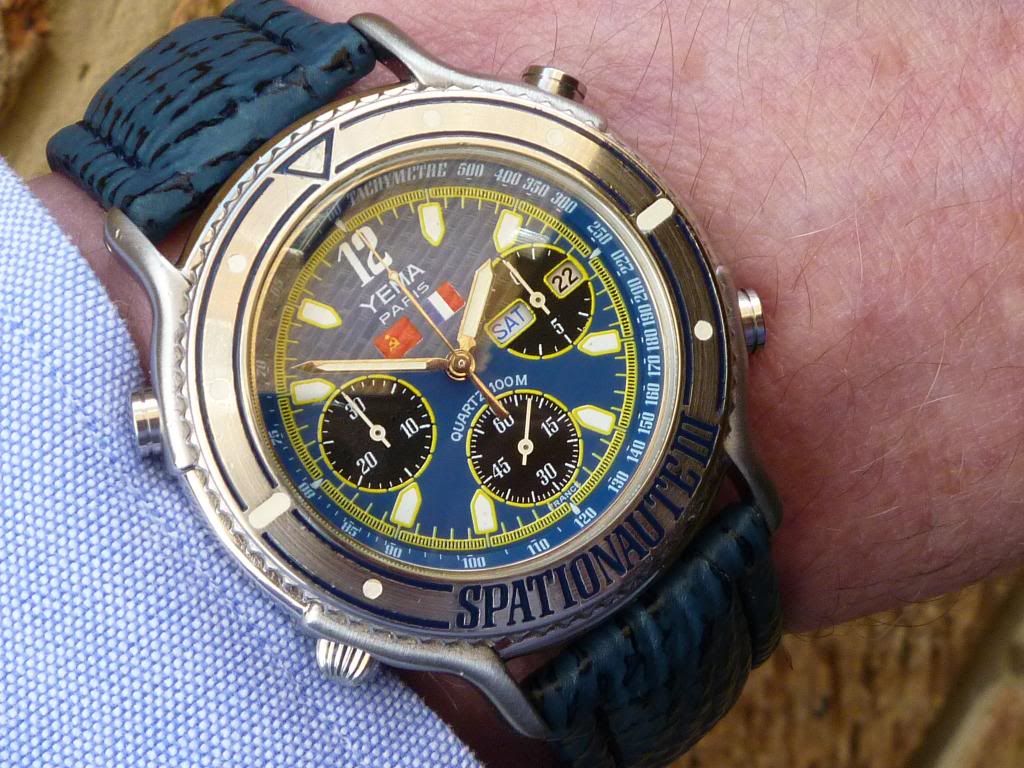 Thanks for the comment, George. But you've overlooked one factor - the original prototype versions of the Yema Spationaute III which were actually worn in space, like Michel Tognini's watch, used a different set of hands to the production watches - silver painted, Yes - but much slimmer, with a correspondingly smaller area of lume. I started off this hand swapping exercise with another purpose in mind. The incorrect polished stainless hands I'd originally fitted (for want of anything better) to my 'bitza' Spationaute III had slightly yellowed lume. At the weekend, I then fitted that set to another Spationaute III, which I'd given the pet name 'Old Yeller', for obvious reasons.