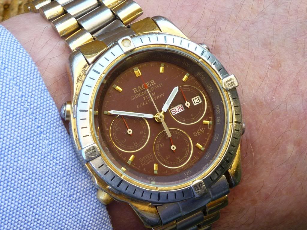Nowt wrong with a good honest 'beater', Chris. This one's a favourite 'beater'. My Orient J39725-70 'Panda' with knocked about case on a cheap and nasty Feiko repro' bracelet.