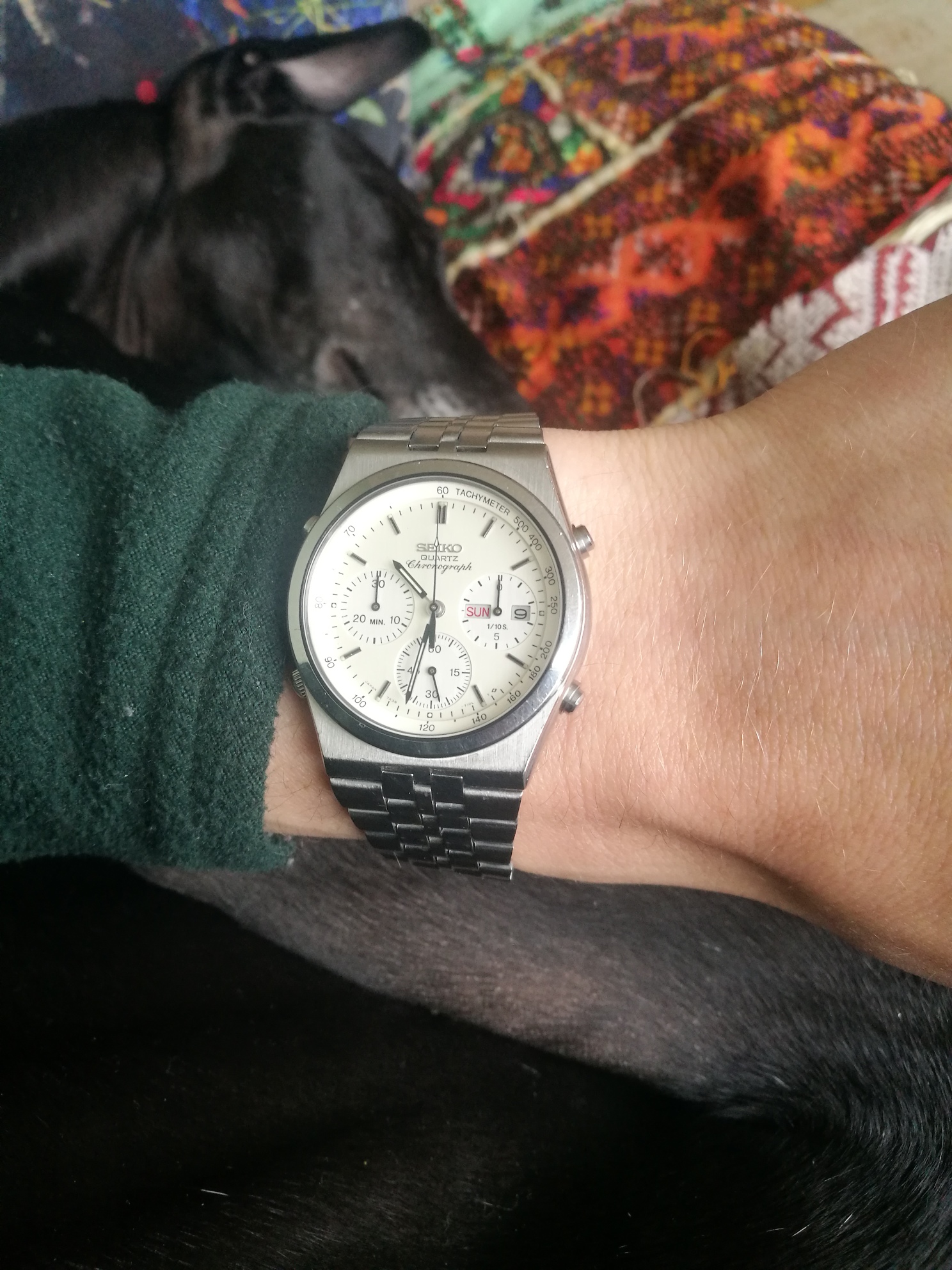 This one landed a few days ago: https://www.ebay.com/itm/Seiko-Quartz-chronograph-titanium-sports100-Black-and-Gold-Mens-Watch/193604667825 Pay no mind to the Buy It Now price. I offered and the seller agreed to significantly less than that. Given the poor quality photos and lack of description, I figured it was a significant risk, but I've been on the lookout for the various titanium 7A28 and 7A38 models, many of which are exorbitantly priced when they appear, and thought I might get lucky here. Sadly, I did not get lucky with respect to the condition of the watch. The bracelet is a poor quality Spiedel (I knew it was non-original even in the fuzzy photos). The cosmetic condition of the case, dial, and hands is actually not bad at all, but the pushers and movement need some work. The pushers are quite sticky - top right has a fairly positive action still, but top left and bottom right are very gummed up. More distressing is the fact that the movement is in bad shape. Nothing moved on arrival. After swapping in a fresh Maxell battery, the main dial chrono second hand and the right subdial both function. The main dial hour and minute timekeeping hands however do not appear to move, nor do the left and bottom subdials. Given that the item description set the expectation that only a battery change was needed, I had decided to save myself some hassle and just opened a return, noting that the movement was essentially non-functional in its current state. The seller responded by stating that he didn't want to bother trying to validate the condition and offered to refund roughly two-thirds of my purchase price, which I accepted. So...I now possess a cosmetically decent example of a 7A28-7069 that needs a fairly significant overhaul, and some kind of bracelet or strap solution. I did open it up for the battery change and was encouraged that there wasn't really any apparent corrosion from battery leakage or water intrusion. I've paid just a bit more than a gas fillup for my Mazda 3 would cost me. Decisions, decisions. | |