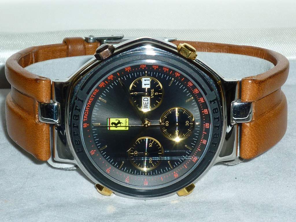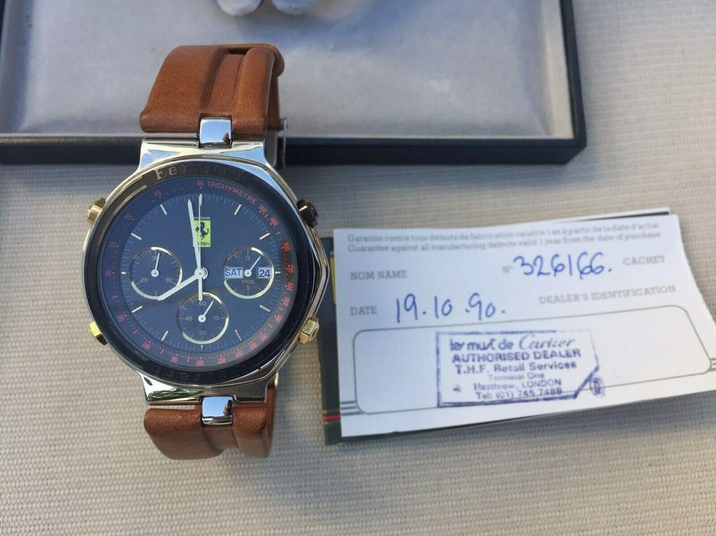 Cartier Ferrari Formula chronograph watch on leather strap. Received as a gift in October 1990 and wore it no more than five times. It has remained in its box ever since. Had it valued in October 2012 out of interest. Comes with its box, International Guarantee, and manual. Bought from les must de Cartier (Heathrow Airport). As per brief research: ‘some of the companies producing watches with a link to Ferrari - however ambiguous - include Cartier with 120 Ferrari-badged chronographs in the 1990s’. The auction ended with bidding @ £360 and reserve price not met. http://www.ebay.co.uk/itm/124284263364 The UK eBay seller re-listed it as another 10-day auction. This time the bidding reached £421, but still with the reserve price not met. http://www.ebay.co.uk/itm/124297755624