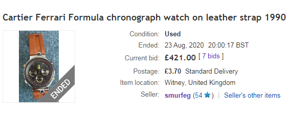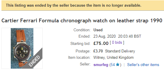 Anyway, to get this thread Rewind (pun intended) back to the first week of August .... A UK eBay seller listed a Cartier Ferrari Formula Cal. 531 chronograph as a 10-day auction, with an opening bid of £75, with a reserve price set. http://www.ebay.co.uk/itm/124284263364 Cartier Ferrari Formula chronograph watch on leather strap 1990