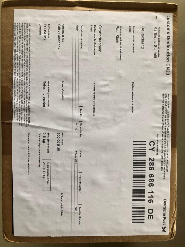 Without waiting for my further instructions, he sent me a couple of photos of the now relabeled package, including this one of the DHL CN23 Customs form. Note that he may have put GIFT in the category, but he'd also stated a value of 500 Euros.