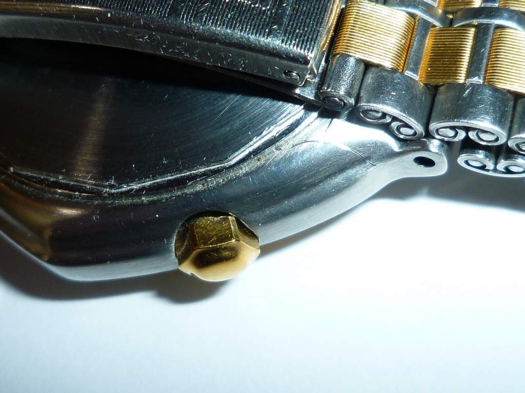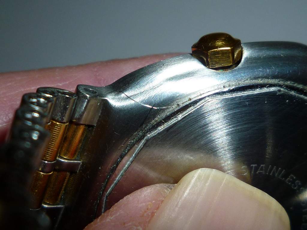 So should I be pleased to have finally received my belated Christmas present to myself - henceforth forever to be known as 'the Brexit watch' ? To tell the truth, despite all the hassle, I'm in two minds as to whether to return it for a refund. It's supposed to be 'new and unworn', though that's not entirely borne out by the photos. It wasn't borne out by the received condition either. When I opened the presentation box, it didn't look like that. The watch was rattling around loose inside. The seller hadn't put any protection around the watch at all. He'd merely closed the lid, relying on the instruction manual and warranty booklet, between the watch and the lid to hold it in place. They didn't. From the DNA evidence present and a few minor scratches and scuffs, the watch has clearly been worn quite a bit in the past (if not for the last 20 years - I'd surmise the 10 before that). The bracelet has been sized for a 7" wrist. There are 13 links on one side and only 11 on the other, meaning that 4 of the original complement of 28 have been removed. They were not supplied. The watch will fit my 7½" wrist by dint of the inbuilt spring-loaded clasp extender - but if you've ever tried using one, you'll know that it's bloody uncomfortable. There is a light scratch about 6mm long on the crystal, running vertically from above the 25 minute mark. There is a nasty scratch on the back of the watch, presumably made by some clumsly watchmaker, attempting to unscrew the case-back without the proper tool. Note the DNA evidence visible in these two close-up shots: | |