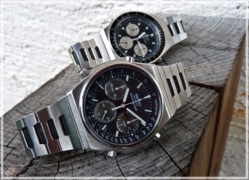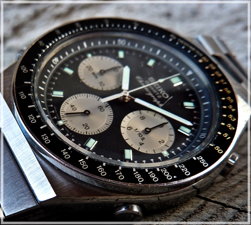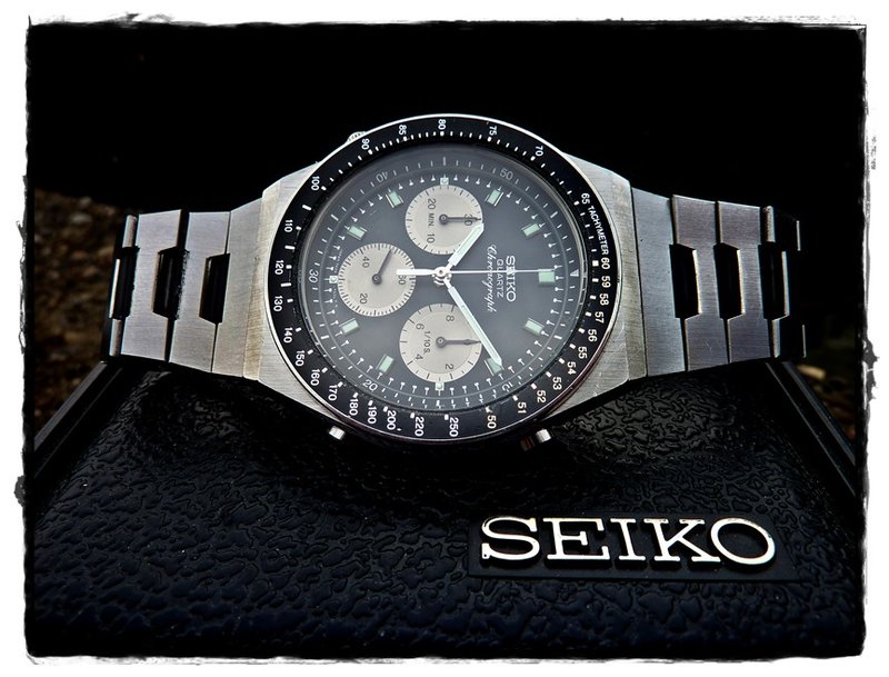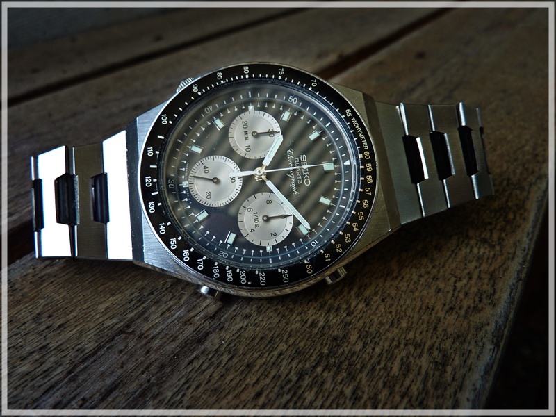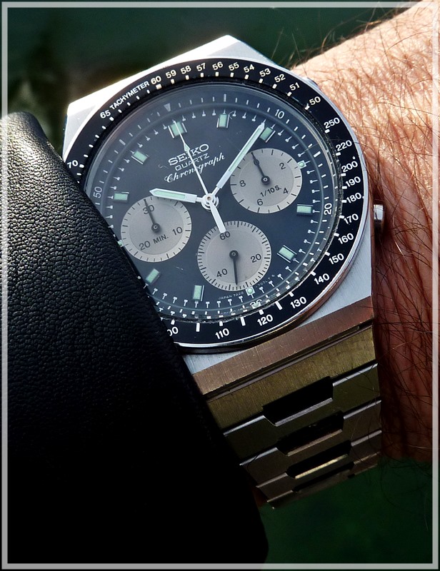 Here is my newest arrival, a 7A38-7000. I already had this model some years back, now I thought it would be a nice addition to my 7A28-703B. The condition is pretty good, actually ideal for me. Not mint, but with only light marks, perfect for everyday´s use.The tachymeter-scale was not in the correct position (I alway wonder how this can happen?), but this could be fixed easily. Everything works as it should, the buttons have the crispy feel like being almost new.:) Without any doubt this model has a lot of interresting details. The case with three differentt finishes (brushed, polished and matt) and the wonderful bracelet. And of course the two-tone dial with the chrome elements and the beautiful tachymeter-scale. Here are some pics: