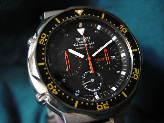 Up for auction a vintage Seiko sport 100 chronograph, has quartz movement, made in early 80s. Purchased then worn very few times and stored away . Still retains its very gorgeous satin finish. Worn few times . It's in excellent close to perfect shape as you can see in pics, no major damages, case and bracelet are virtually perfect. All functions work properly. great vintage timepiece. SOLD AS IS. All as per pictures, what you see is what you get. Don't miss these rare and beautiful watch! NO RESERVE AUCTION! .... ------------------------------------------------------------------------------------------------------------------------------------------------------------------------- Most recent seen on Yahoo Japan, February 2012 - only average example with faded bezel numbering. Originally listed with an opening bid 50,000 Yen: http://page13.auctions.yahoo.co.jp/jp/auction/r87009078 SEIKO 7A38-6020 SPORTS100 クロノグラフ 希少 ジウジアーロ