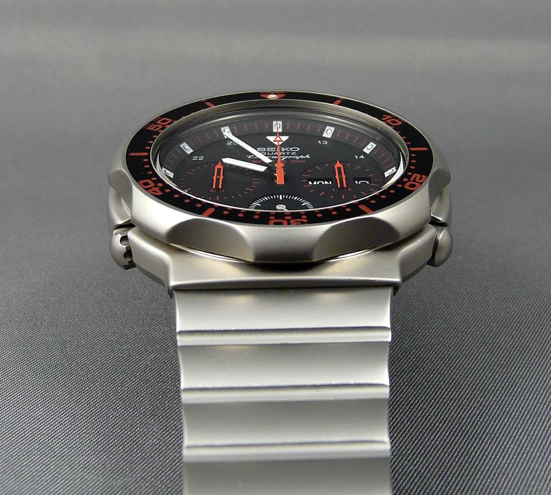 and you'll see a small ding / gouge on the bottom R.H. corner of the watch case, between the 25 and 30 marks on the bezel. Personally, I don't think by swapping the bracelet from his 7A38-7050 that A.Braniff (Lesterplant) has added any value to this watch. It deserves to sell for no more than he paid for it - $230. All he succeeded in doing was devaluing the 7A38-7050 he sold previously. | |