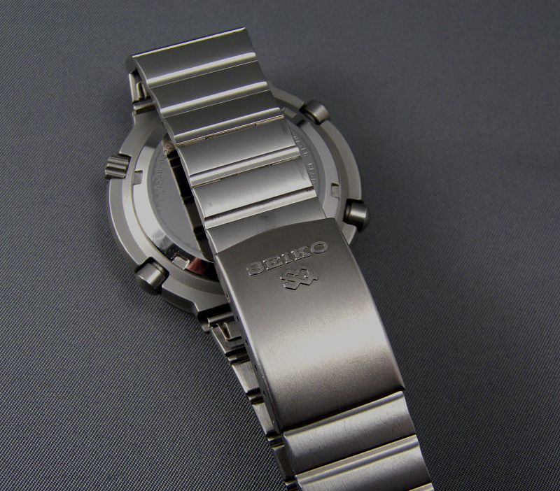 Bracelet is Seiko p/n Z1207S. Underside of first joining links are stamped Z1207. Bracelet is all over satin Silver anodized finish. The bracelet tapers from 23.5mm to 18mm at the clasp. Adjustment links are retained by / pivot on 1.0mm diameter push pins. Bracelet fixing is by Pin and Tube, Seiko part numbers 81601169 and 81180109. Clasp has 5 adjustment hole settings, measures 30mm x 18mm; stamped Seiko SQ in satin Silver anodized finish.