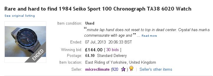 Reserved for sales in 2012: Recent eBay Italy example, which sold for $876.66 (approx £554). See: http://www.ebay.co.uk/itm/260944084104 Vintage 1980s Seiko Quartz Chrono Sport 100 7A38 6020 wrist watch
