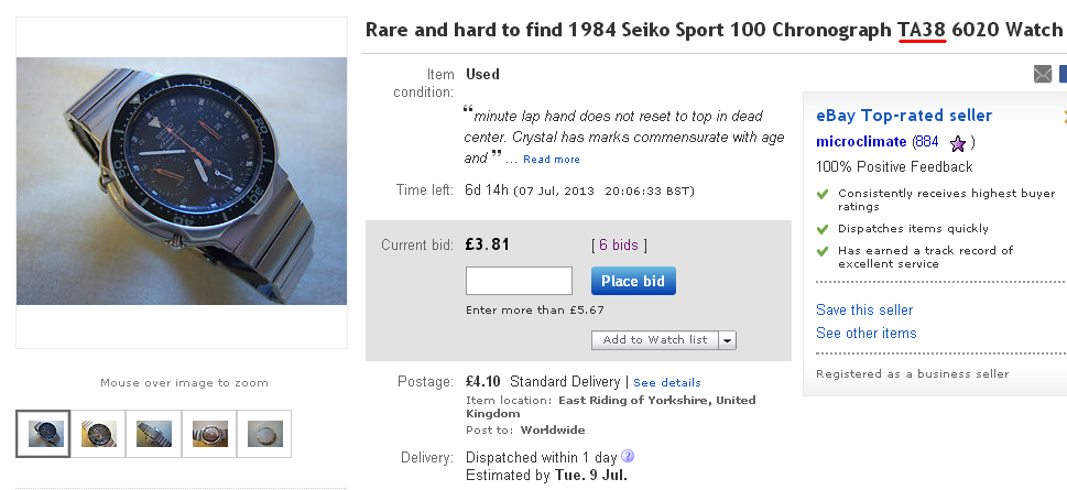 A rare seiko chronograph in good used order, an excellent time keeper. The starting price was a rather pointless £0.01, particularly as the seller had set the reserve price at a relatively sensible £85. I never quite understand why sellers do that. It sold on 4th May for a healthy £173.00 (approx. $280.29) after 21 bids - double what I'd paid for my similar example a year ago. ------------------------------------------------------------------------------------------------------------------------------------------------------------------------ Probably hoping to cash in on the previous sale, Indonesian seller 'Silverliona' offered this lesser example on SCWF two weeks later: http://www.thewatchsite.com/index.php/topic,32167.html FS : a rare and hard to find Seiko 7A38-6020, USD 350 OBRO « on: May 19th at 12:51:27 AM »