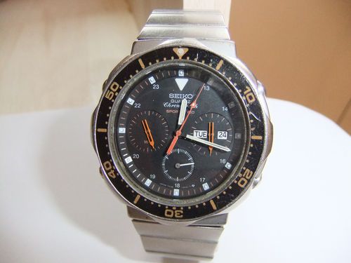 Seiko Quartz Chronograph Sports 7a38 - 6020 Watch Movement : Seiko Quartz cal 7A38 - 6020 day date, Crystal : Original crystal Hands : Original Crown and pusher : Original Bezel : rotate bidirectional The watch is running very good The bezel insert was faded and split in the usual place at the top. It was fitted with a rather incongruous looking 'croco' leather strap. | |