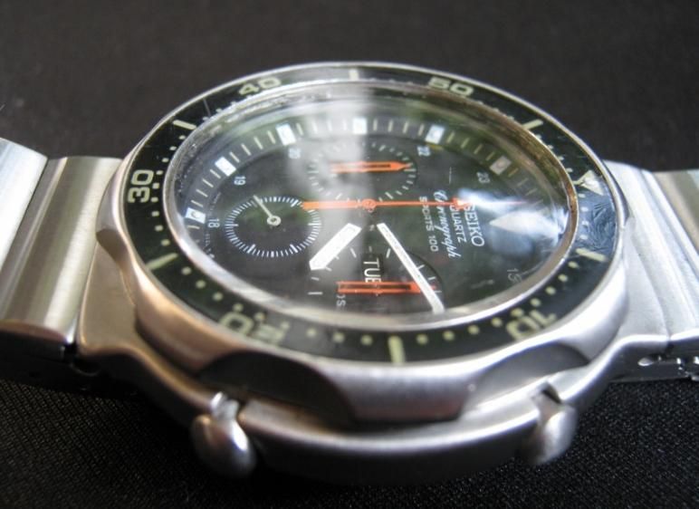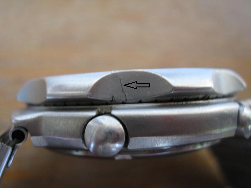 Although larger, they didn't show the watch in any more flattering light. Note also the crack in the bezel (arrowed) not visible before. ------------------------------------------------------------------------------------------------------------------------------------------------------------------------- Hardly worthy of mention, but as I'm in 'photo upload mode', I may as well .... this 7A38-6020 'parts watch' was listed on eBay in June: http://www.ebay.co.uk/itm/160818015716 VINTAGE SEIKO QUARTZ CHRONOGRAPH SPORTS 100 7A38-6020 FOR PARTS