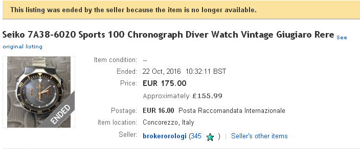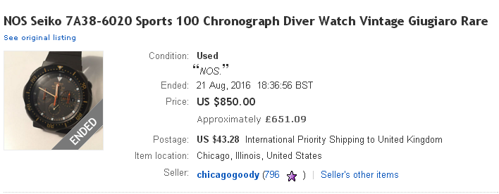 The description doesn't tell you a great deal, but that one photo was enough to identify precisely which 7A38-6020 this actually is .... It's a watch that has already featured in this thread on numerous previous occasions, starting at the top of page 3 back in April 2015. The giveaway being those small grazes to the bezel's brown PVD coating, near 50 on the Tachymeter scale. Oh, Yes and then there's the faded bezel inlay numbering and dial printing that I've also mentioned umpteen times before in my previous posts. Here's a brief summary of this watch's previous sales history. (You can read the full story for yourselves on pages 3 and 4). It first appeared on eBay in April 2015, offered as a low start auction by Italian seller maddys65. It sold on 21/04/2015 for 412 Euros (approx. $450). That auction was won by US collector Mike Mounce. As I wrote at the time, I wasn't quite sure why Mike bought it, because he already owned a nicer example, but he does appear to have swapped the case-back. Mike offered it FS on the SCWF Trading Post in June 2015, asking $425 (which is when I noticed it was now fitted with case-back serial # 4O5756). He also listed it on eBay (seller ID pmounce) asking $450 as a Buy-it-Now. It sold off eBay for $375 on 23/06/2015 to US collector Peter Taubman, who from his email, clearly seemed to be in denial about the faded bezel numbering. He, in turn, listed it on eBay (seller ID gr8sw) in January 2016 asking $695 as a Buy-it-Now, but sold it on 26/01/2016 for a Best Offer of $510. It was purchased by a would-be profiteering re-seller of the worst kind. This US eBay seller chicagogoody first listed it in April 2016, offered with a NOS bezel and an absolutely ludicrous Buy-it-Now asking price of $1500 !! http://offer.ebay.co.uk/ws/eBayISAPI.dll?ViewBidsLogin&item=262469096523