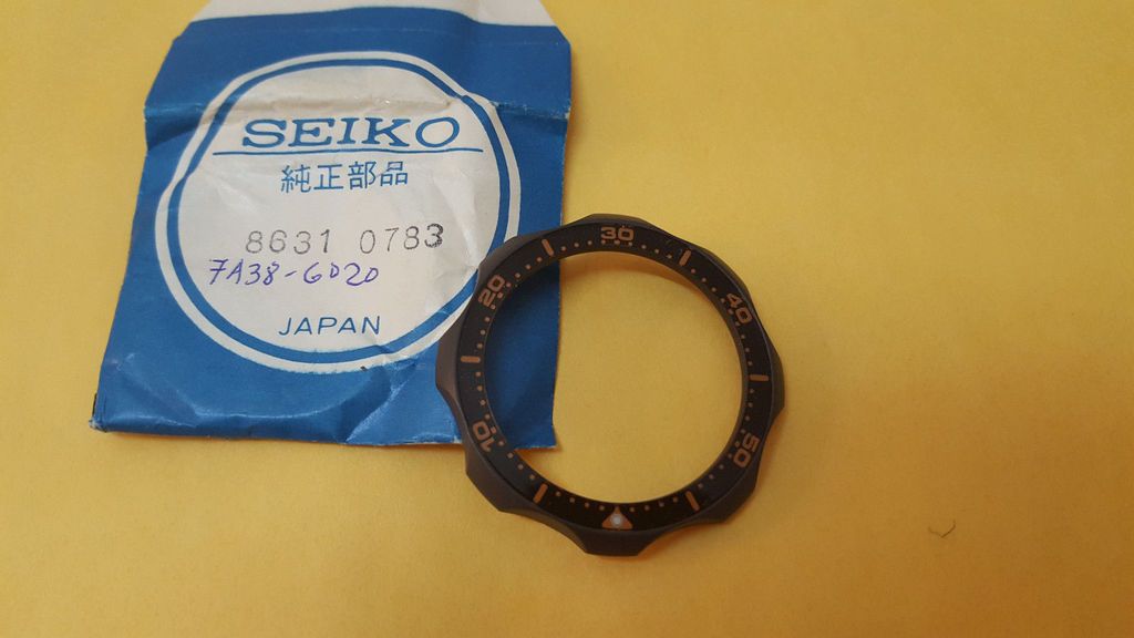 But the brown coated 7A38-6020 that he's now offering FS on SCWF isn't the same as he bought from maddys65 in April. They may both have fresh looking JWC inspection stickers in place on their case-backs, but the serial number of that one was 4D5881, whereas the one he's now selling with the same scratched / faded inlay bezel is 4O5756. So there's clearly been an element of parts swapping going on between them - if not just the bezel and / or case-backs. I bet he's kicking himself now those NOS bezels are for sale on eBay. | |
