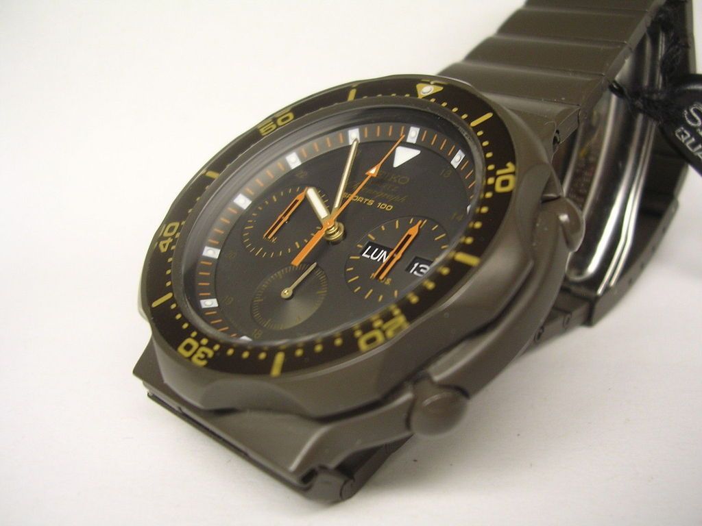 Raro Orologio subacqueo Seiko Chronograph Sports 100, cassa in acciaio massiccio da 43 mm, escluso corona,di particolare colore grigio marrone, ghiera girevole a scatto bidirezionale, vetro bombato, bracciale originale, movimento Seiko 7A38, perfettamenete funzionante in tutto, orologio è in condizioni eccezionali, Nuovo!! fondo di magazzino, mai usato e completo del tag originale, non garantisco l'impermeabilità, tutto come da foto. It may have been NOS once, but it isn't any more. Apart from the scratches in the brown coating on the bezel near 50, through to the black chrome plating underneath, the once orange bezel inlay lettering and dial printing (SPORTS 100 and upper sub-dials) has faded to yellow, through exposure to sunlight. Possibly might be an ex-shop window display model, I suppose. Looking at the position of the pin in the adjustable clasp, in the last set of holes, I reckon the bracelet could be short of at least one removable adjustment link, from it's original complement. The bracelet has a total of 19 links, indicating it will fit a maximum 7½" wrist. Oh - and ignore the hang tag. | |