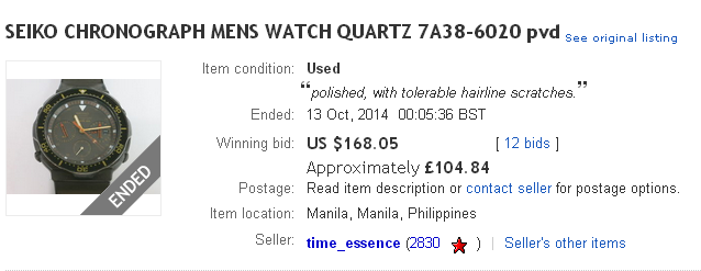 Welcome to my auction [ WATCH DETAILS ] Product : SEIKO 7A38-6020 QUARTZ Chronograph SPORTS 100 Movement. & Movement No : Quartz Battery. Cal.7A38 Case Serial Number : 405846 Material of Case : Base Metal + ST Steel back. Dial Color : Brown Case Size : 43.5mm (with out crown) The length of the belt : About 18.5cm Band Material Types :Base Metal TOF + ST. Steel Working condition : Perfectly working Comdition. In new Battery. It was overhaul in November. Condition of Case : A Very very little bit of scratch Condition of Case back : A little bit of scratch Condition of Bezel :A Very very little bit of scratch Condition of Dial : no scratch Condition of Hands :A Very little bit of scratch Condition of Crown : no scratch Condition of Glass : A Very very little bit of scratch Condition of Band : A Very very little bit of scratch Please look at the pictures for more detail. Scratch is rarely visible. Mint condition ! Manufacturer Warranty : 1 Year. Instruction Manual :NO. With SEIKO box. 100% Genuine Seiko. I'm sorry. I can not Buy It Now. As you can see from my screen print, it was originally listed with a 'pie-in-the-sky' Buy-it-Now price of $650 - which makes a nonsense of the seller's last statement. Academic now - bidding is under way and the B-I-N option gone. It'll be interesting to see if it makes anywhere near the $590 that this would-be profiteering Japanese re-seller paid Stuart (rubyginny) for it in October 2014. | |
