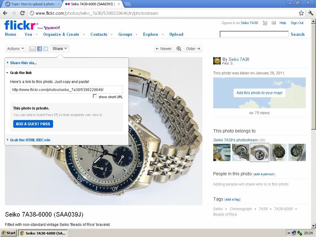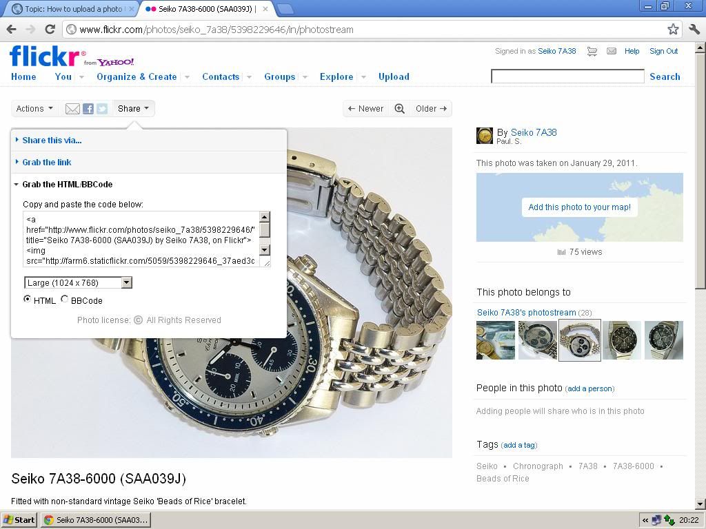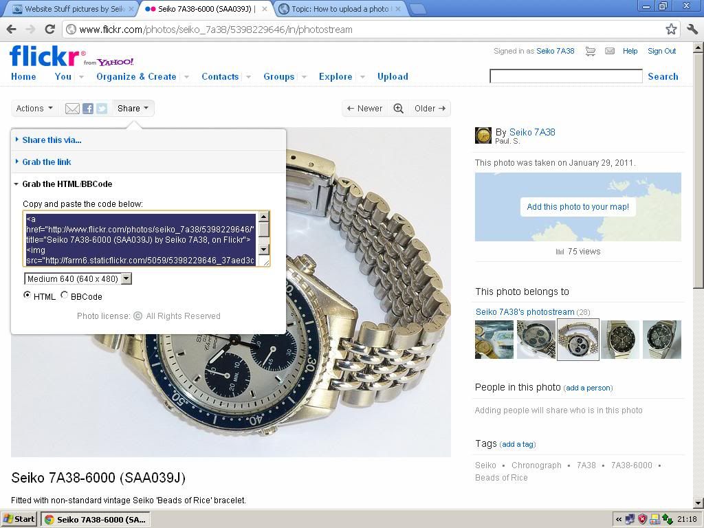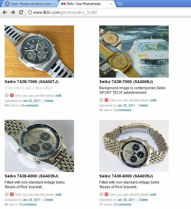 Most of you have already written posts on other watch forums including remotely-hosted embedded photo images. It's not difficult on this forum either - just slightly different (in the coding you use, and how you actually do it). First of all, if you haven't already got one, you'll need to open a photo hosting account on Flickr, ImageShack or Photobucket. I've used all three at various times but for ease of use I'd recommend Photobucket. You'll need to upload your photos first. Here's a screen-print of one of my Photobucket sub-albums I've been using earlier today: