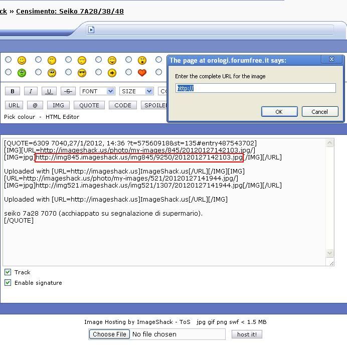 The way I'm going to cheat, is by copying the ImageShack coding, instead from Manuel's recent post on Orologi & Passioni. See: http://orologi.forumfree.it/?t=57560918&st=135 How you, as a user, actually extract that part alone, from ImageShack's lengthy coding, is for you to figure out for yourself. The way you can use ImageShack on this forum is similar to the way I used part of Flickr's image coding in the previous post. You just need to crop out the part of their code you actually need, beginning http ... ending jpg [outlined in red] - and copy it.