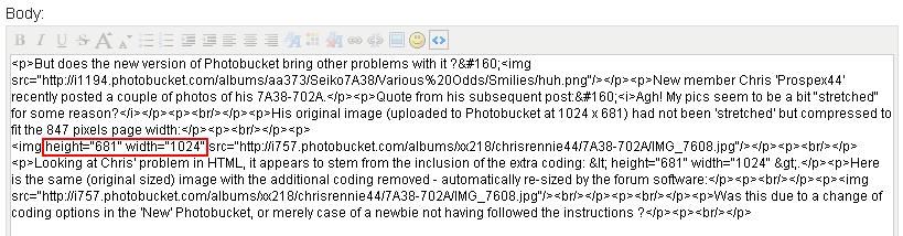 Again, slightly different from other forum software, you do NOT just drop the code you've clicked straight into the text body. If you do, this is what will happen: http://i1194.photobucket.com/albums/aa373/Seiko7A38/7A38-60x0/P1030867-Resized.jpg Instead, you need to click on the 'Insert Image' icon (to the left of the smiley), which opens a pop-up window, like this:
