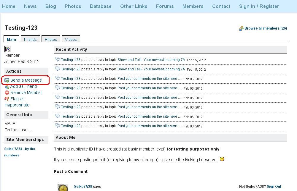 .... which is bl**dy annoying - particularly if you click the 'back arrow', expecting it to take you back to your unsent PM. It doesn't !! However, what I have found, on the occasions when I have screwed up the Captcha 'words' and failed to send a PM, clicking again on 'Send a Message' (to the same person) brings up your original unsent message. So all is not lost - he says, fingers crossed. The message recipient will receive an email, which includes the entire content of the PM. Unlike leaving a comment on someone's profile, where the notification appears to only include the first sentence. You can view / manage your PM inbox on your own profile. One other thing - unlike certain other watch forums, there is no pre-requisite number of posts needed before you can send PMs. | |