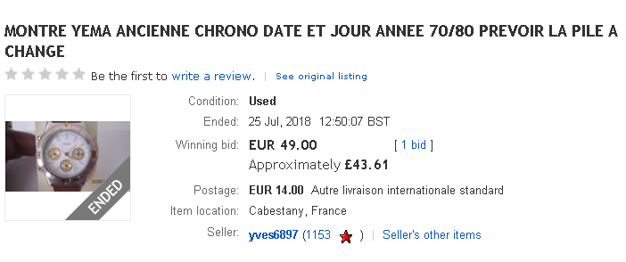 After re-listing it twice more, with that same title of just SUPERBE YEMA PARIS, seems it eventually dawned on the French seller that it might help if he actually added the word MONTRE to his title. http://www.ebay.co.uk/itm/273375951229