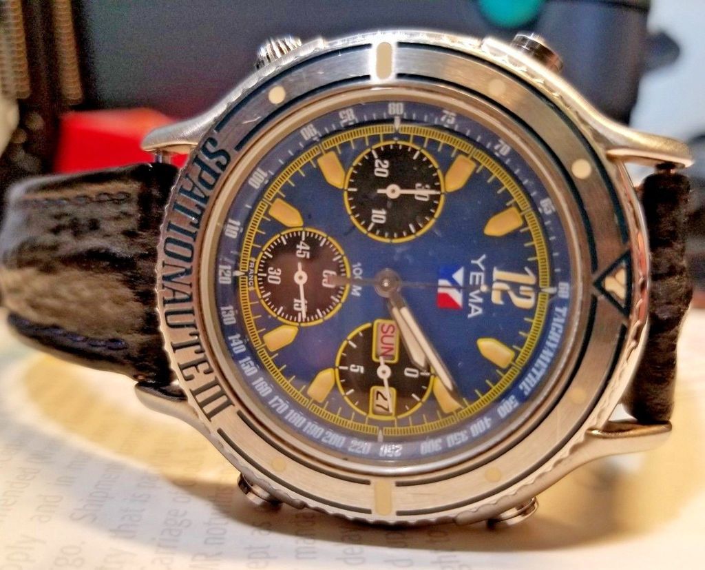 Vintage Yema Spationaute III Split Second Chronograph Day Date Watch. The Watch has been in storage since the 90's. Minor scratches to the Case back. Original Box And tags. The watch needs a new battery. Take a close look at the pictures and ask any questions before purchasing. Thanks for looking. If you have been banned in the past “P,S” from buying off me do not use another account to try to bid on this watch. Thank you. PS - Could he possibly be referring to me ? | |