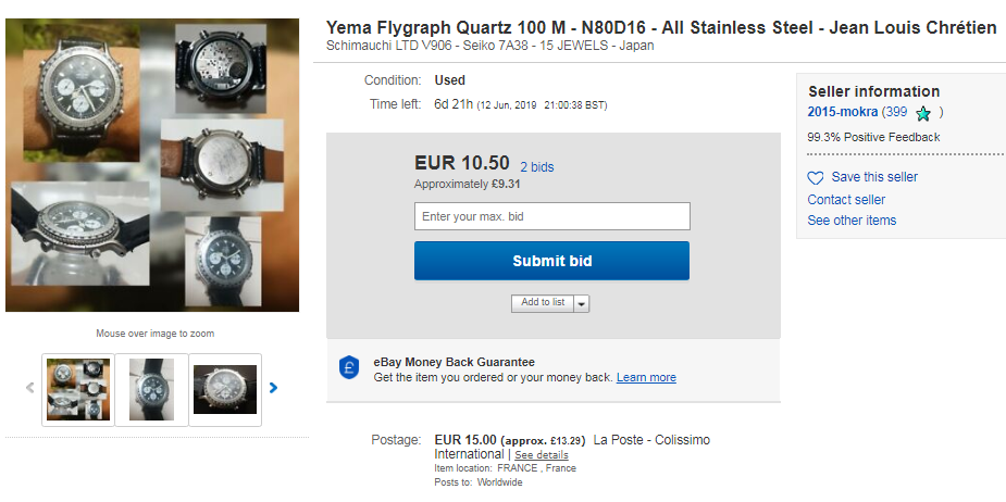 The above quoted 7-day French eBay auction for a Yema N8 Flygraf, in average worn condition ended a few moments ago - in what can ony be described as the best Italian tradition. ![]() But if you check the bidding history, you'll quickly conclude as I did, that it was obviously shilled by not one, but two Zero feedback bidders (one newly created), who needless to say, both have 100% activity with the seller. Which goes to show what a complete and utter load of tosh this line from the seller's description really is: Profiles less than 5 reviews contact me directly before bidding otherwise the sale will be canceled. I suspect the losing bidder (who bid 155 Euros), will be receiving a second chance offer anytime soon, probably before I've even finished composing this post. | |