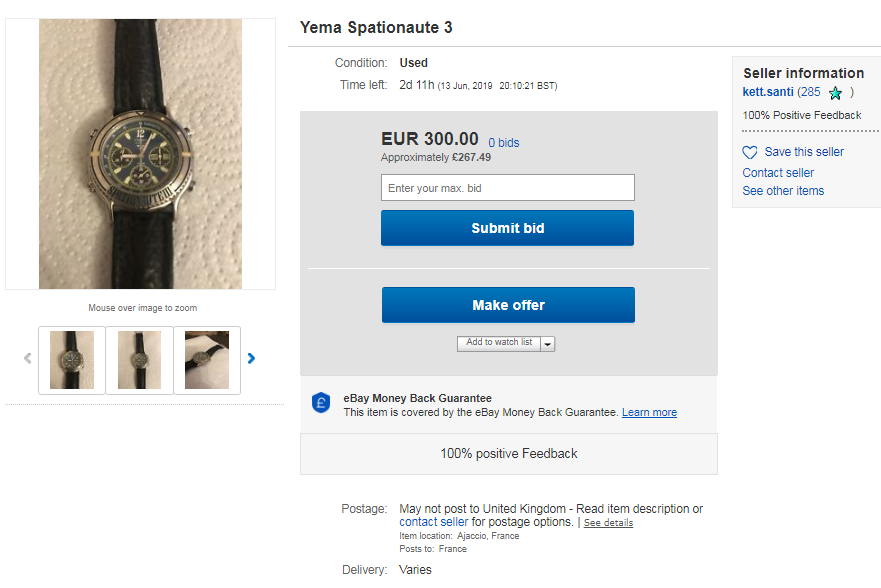 The 3-day French eBay auction for a Yema Spationaute III, in evidently decent used condition, ended a few moments ago, selling for 400 Euros after 4 bids. http://www.ebay.co.uk/itm/293117364068