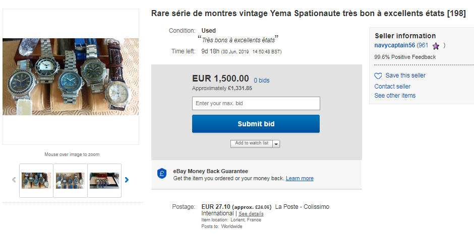 The winning bid of 151 Euros was a fair price. It was not in such good condition. There are better examples to be found. Be patient. Speaking of collections of Spationautes, have you seen this ? This collection of Yema Spationautes, including a 43mm III, model # N80P76, fitted with a non-original bracelet and a white dialled 38mm 'reduced', model # N80A696, was listed in an 'Instant Collection Job Lot' earlier this afternoon, by a French eBay seller, as a 10-day auction listing, with an opening bid price of 1500 Euros. Incidentally, this is the same French eBay seller navycaptain56 who was already separately listing another Yema Spationaute III (fitted with a non-original bracelet and missing a pusher - see previous page), now re-listed as item # 223552577638 and another different 38mm 'reduced', already posted higher up this page, re-listed as item # 223557244438. http://www.ebay.co.uk/itm/223558810497