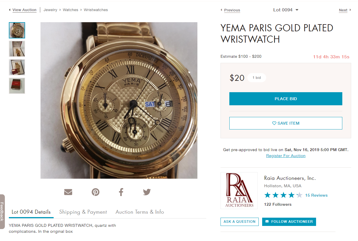 The LiveAuctioneers auction for a blingy Yema N81W63 Breguet Classique clone, fitted with a non-original bracelet ended a few minutes ago, selling for $80 (plus 25% Buyer's Premium) after 3 bids - totalling $100. I'd already bid it to $80, this afternoon, prior to the auction going live, expecting to be outbid. I wasn't. https://www.liveauctioneers.com/item/77772463_yema-paris-gold-plated-wristwatch